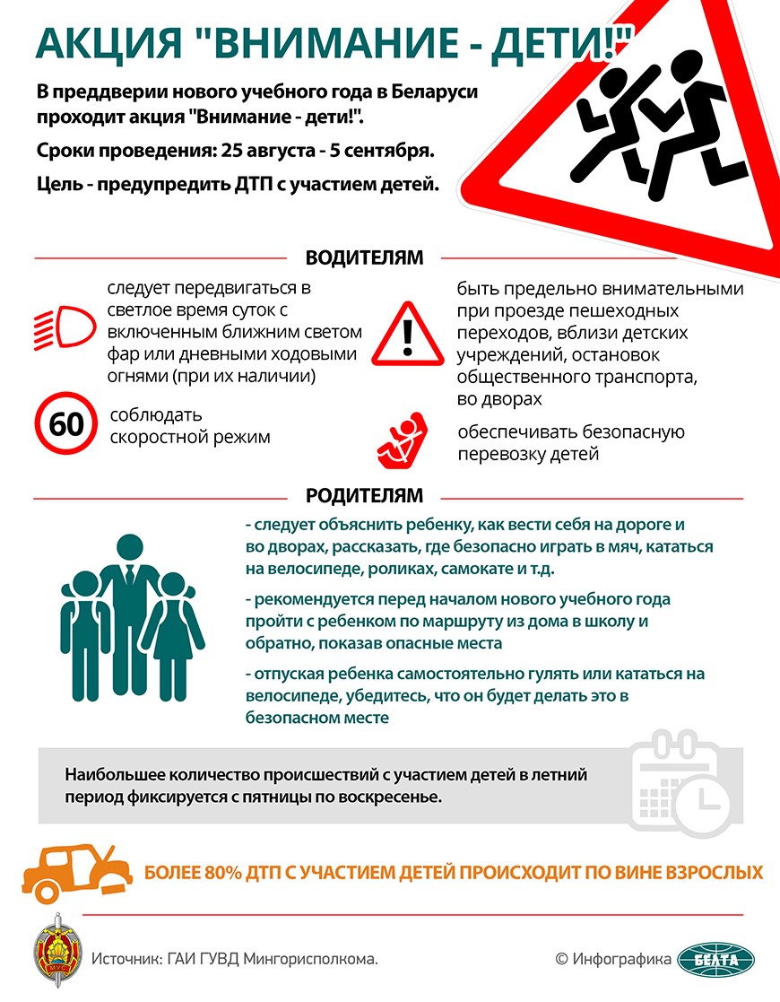 С целью предупреждения детского дорожно-транспортного травматизма в период с 25 августа по 5 сентября в Республике Беларусь проводится специальное комплексное мероприятие «Внимание — дети!».