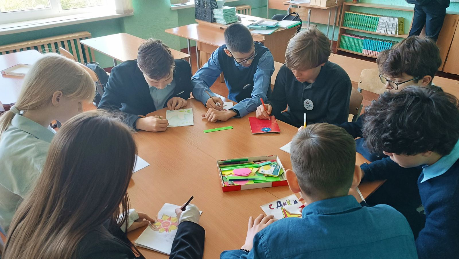 В преддверии Дня Победы учащиеся 8″А» класса подготовили поздравительные открытки для ветерана педагогического труда Ковальчук Нины Алексеевны, которая из- за преклонного возраста и плохого самочувствия уже не может лично встречаться с ребятами. Поэтому несколько раз в год школьники адресуют ей самые искренние пожелания на открытках, сделанных собственноручно, а затем отправляют их адресату посредством «Белпочты».