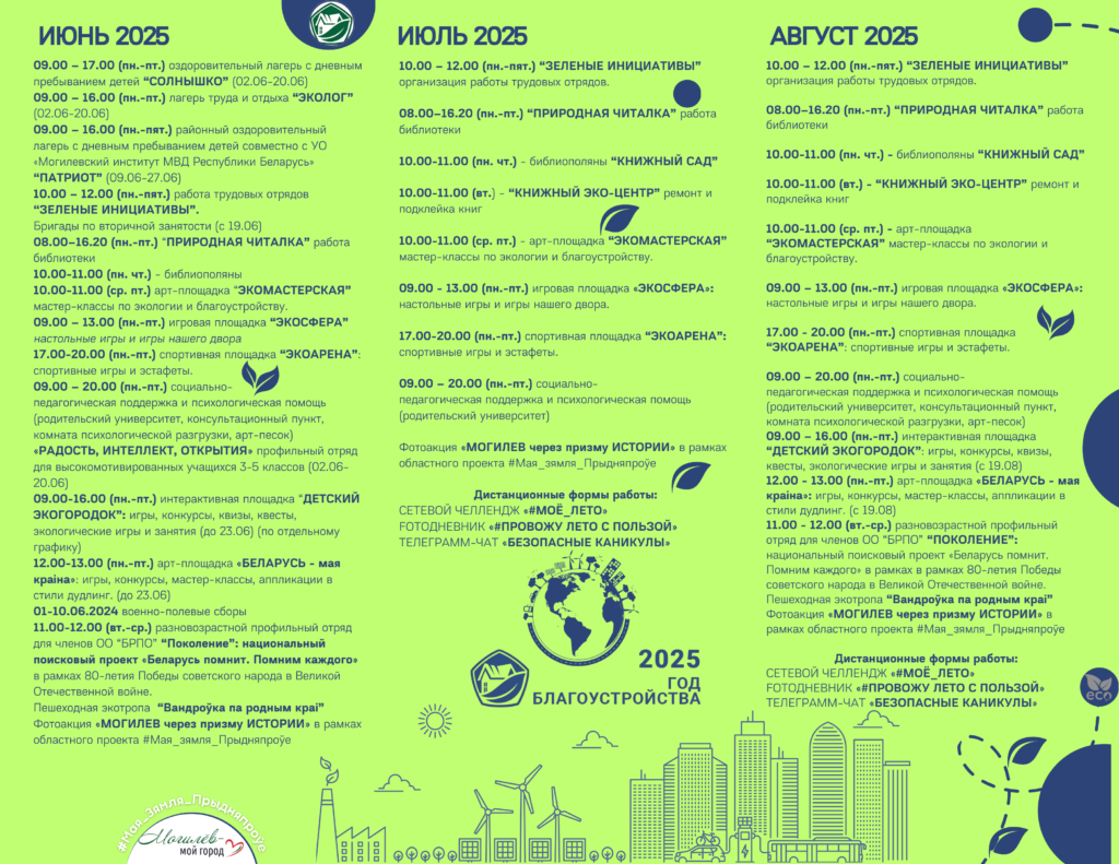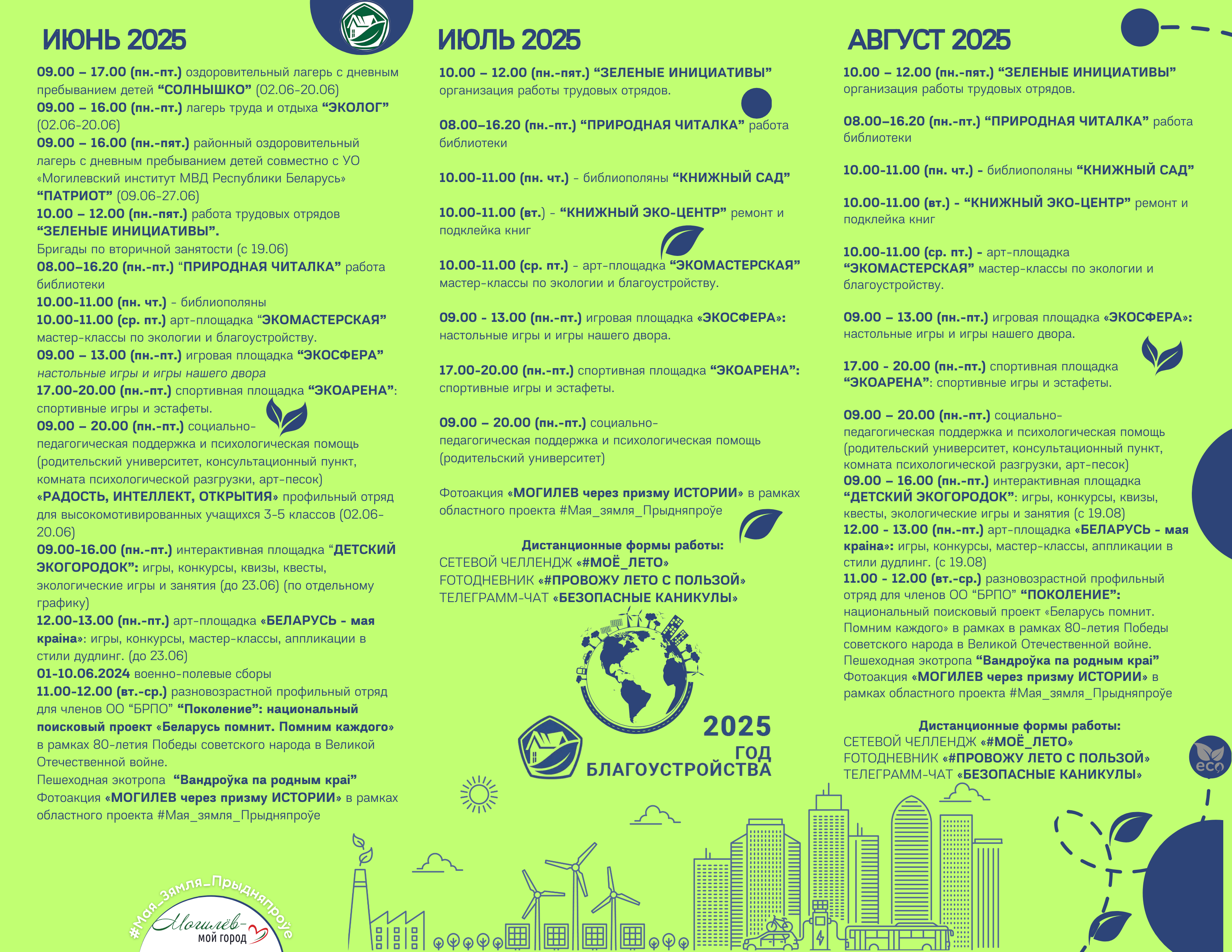11.00-12.00 (вт.-ср.) разновозрастной профильный отряд для членов ОО «БРПО» «Поколение»: национальный поисковый проект «Беларусь помнит. Помним каждого» в рамках 80-летия Победы советского народа в Великой Отечественной войне.