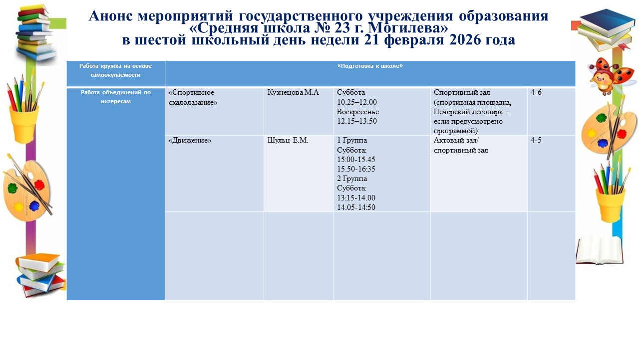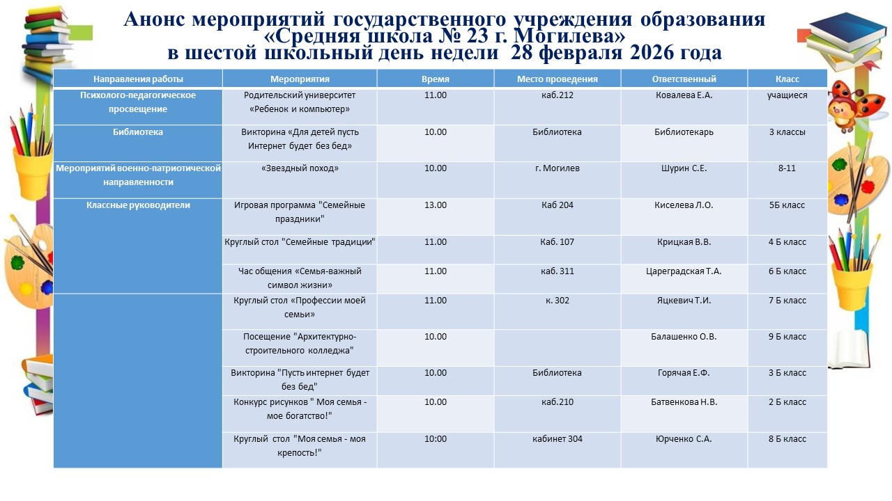 План мероприятий государственного учреждения образования «Средняя школа № 23 г. Могилева» в шестой школьный день недели 28.02.2026 года День взаимодействия с семьёй