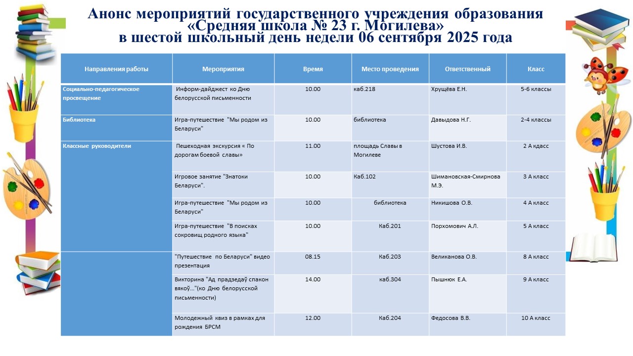 План мероприятий государственного учреждения образования «Средняя школа № 23 г. Могилева» в шестой школьный день недели 06.09.2025 года День гражданского и патриотического, духовно-нравственного воспитания