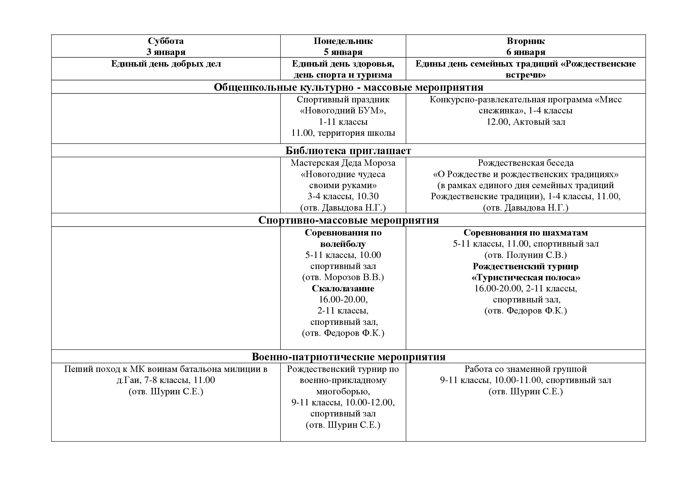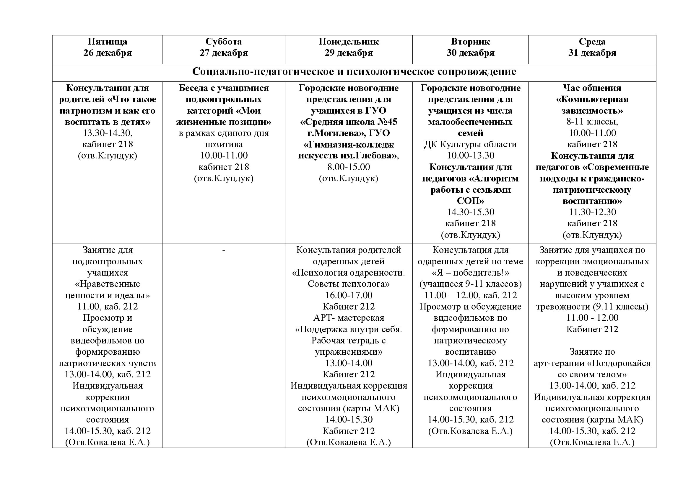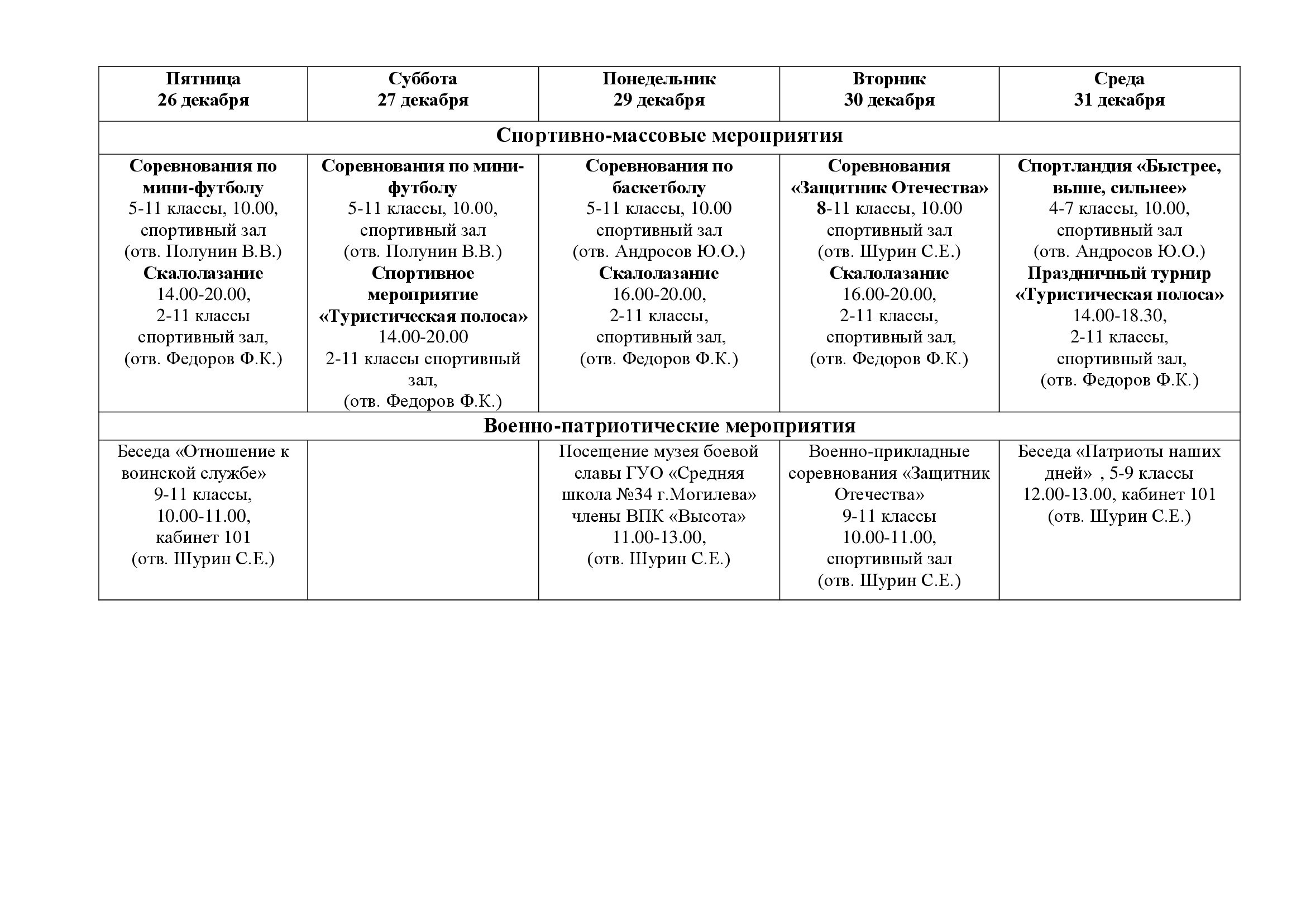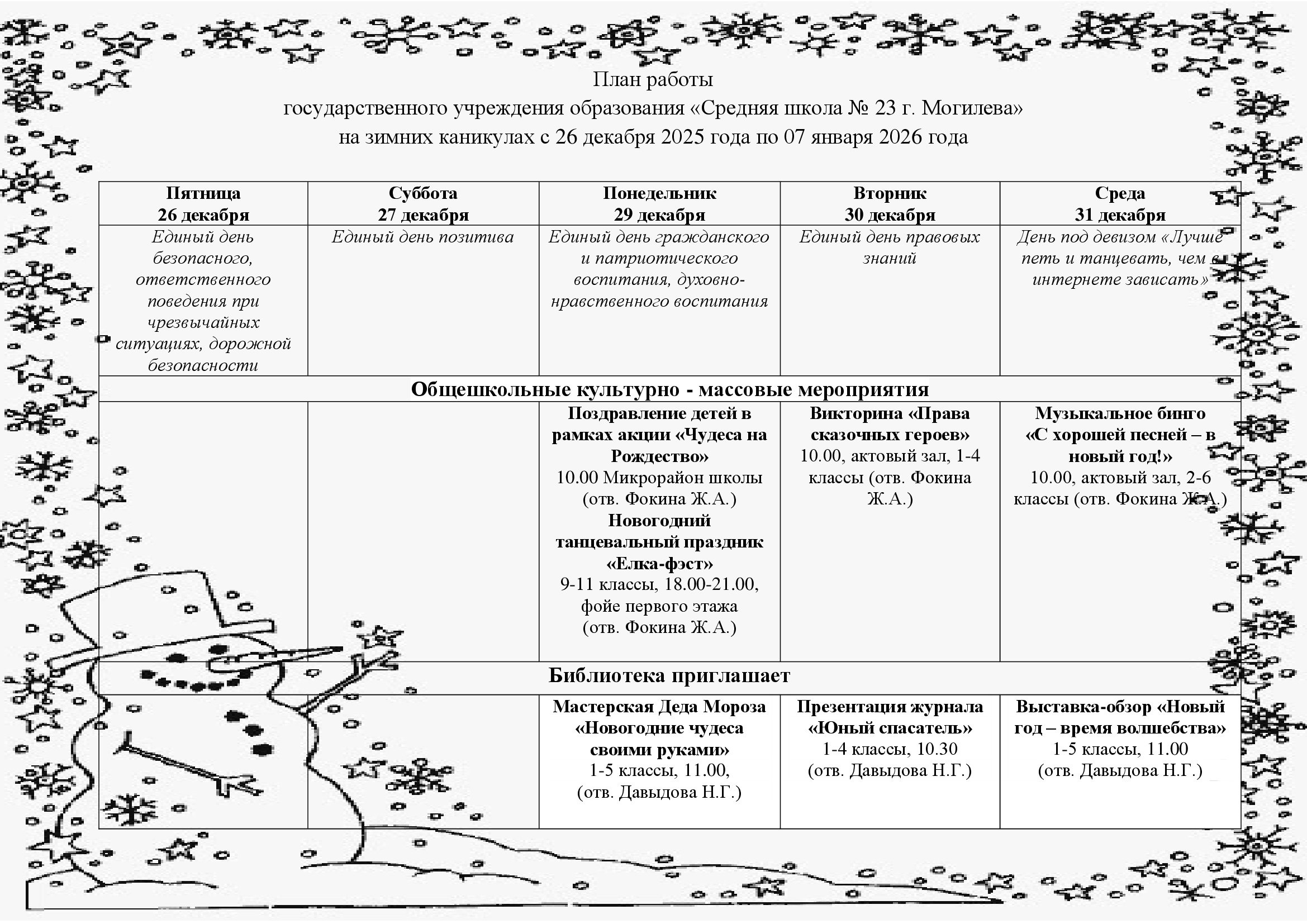 План работы государственного учреждения образования «Средняя школа № 23 г. Могилева» на зимних каникулах с 26 декабря 2025 года по 07 января 2026 года