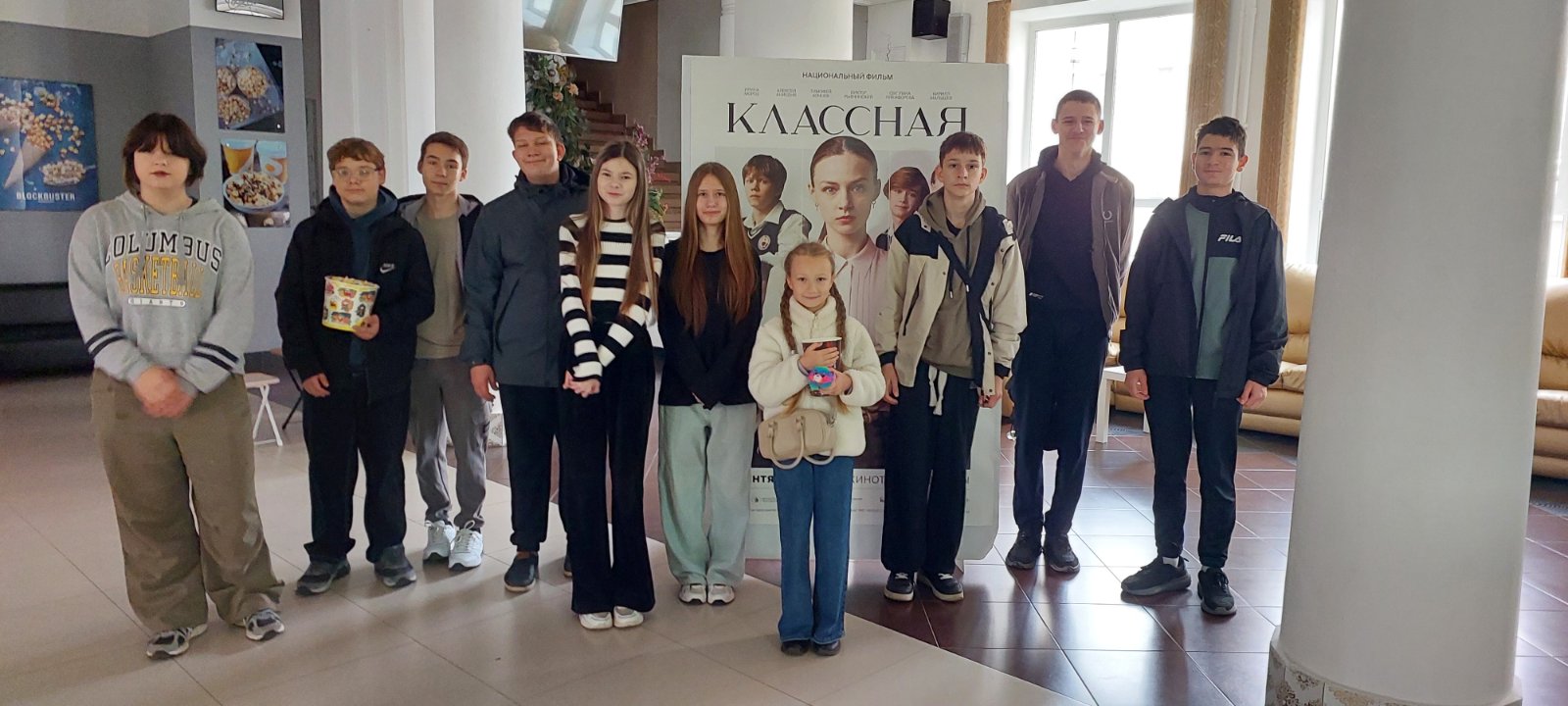 11 октября в рамках мероприятий шестого школьного дня учащиеся 9 «В», 8 «В» и 5 «Г» классов посетили кинотеатр «Родина» и посмотрели фильм «Классная». Это фильм о школьной жизни, о взаимоотношениях учителей и учеников, о готовности помогать и идти на компромисы