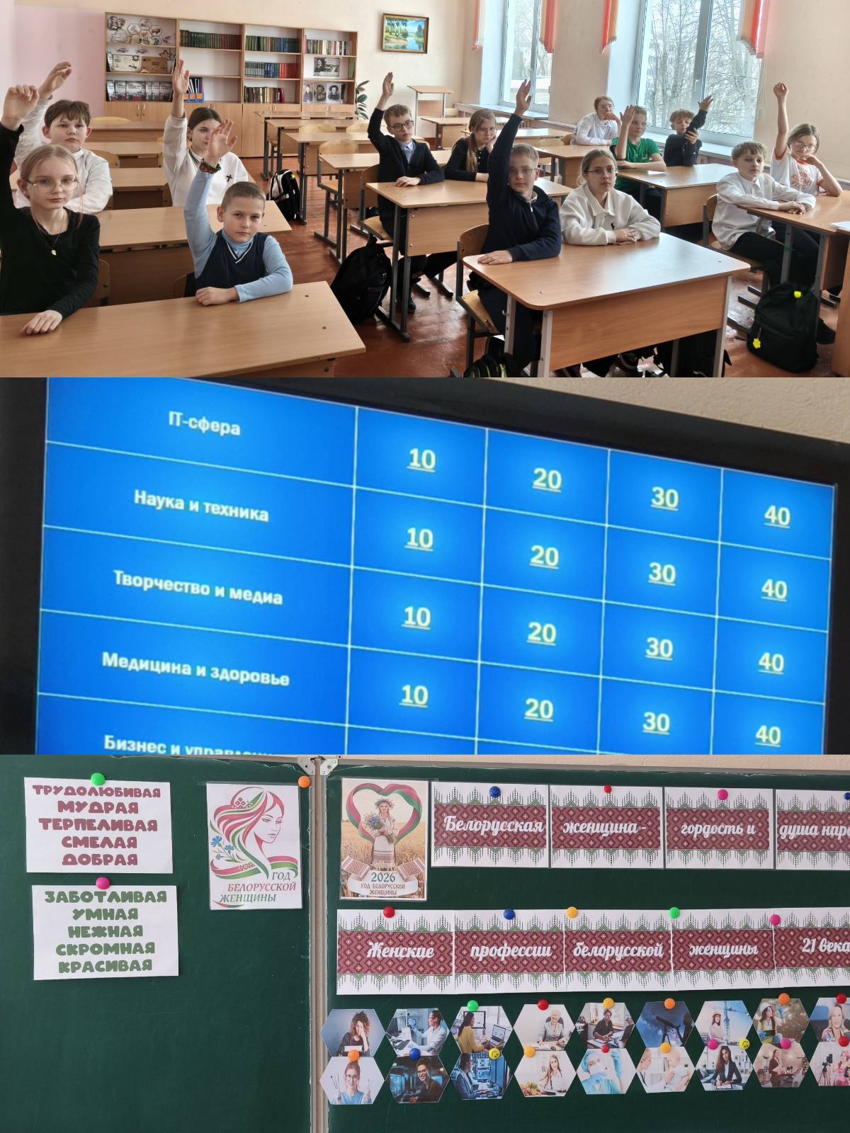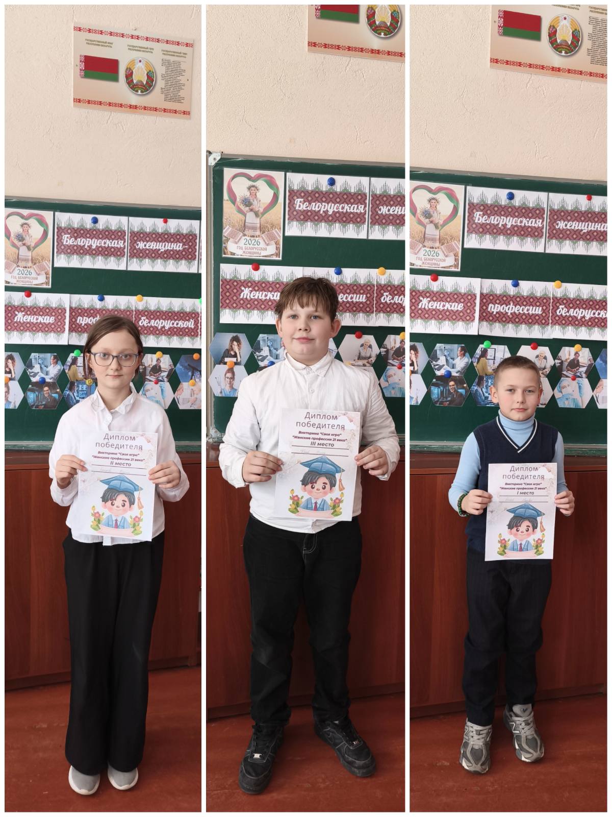 20 февраля в 5 «Г» классе прошёл информационный час «Женские профессии 21 века», посвящённый Году белорусской женщины. С ребятами была проведена «Своя игра», в ходе которой они убедились, что сегодня белоруска — это не только хранительница домашнего очага, но и высококлассный специалист в самых разных сферах. Мы видим женщин за кафедрой университетов и в операционных блоках, в кабинах больших грузов и в рядах Вооруженных Сил, на ответственных постах в милиции и в космосе. Игра была очень напряжённой и весёлой. Самые активные ребята были награждены дипломами.