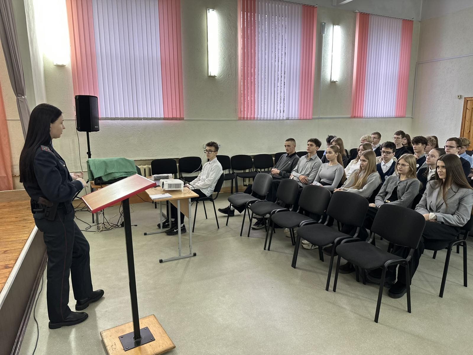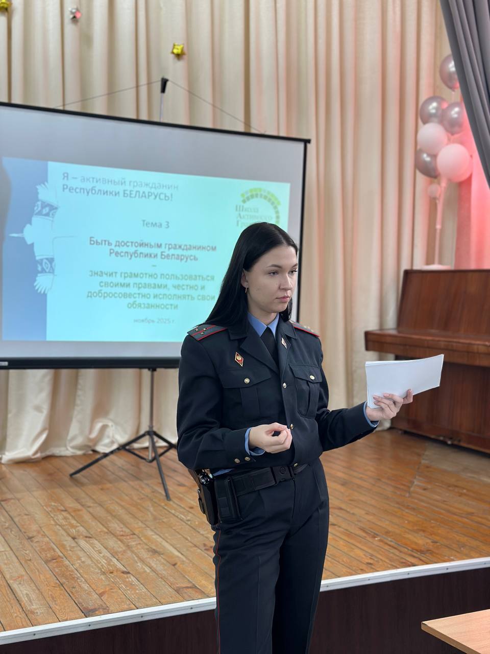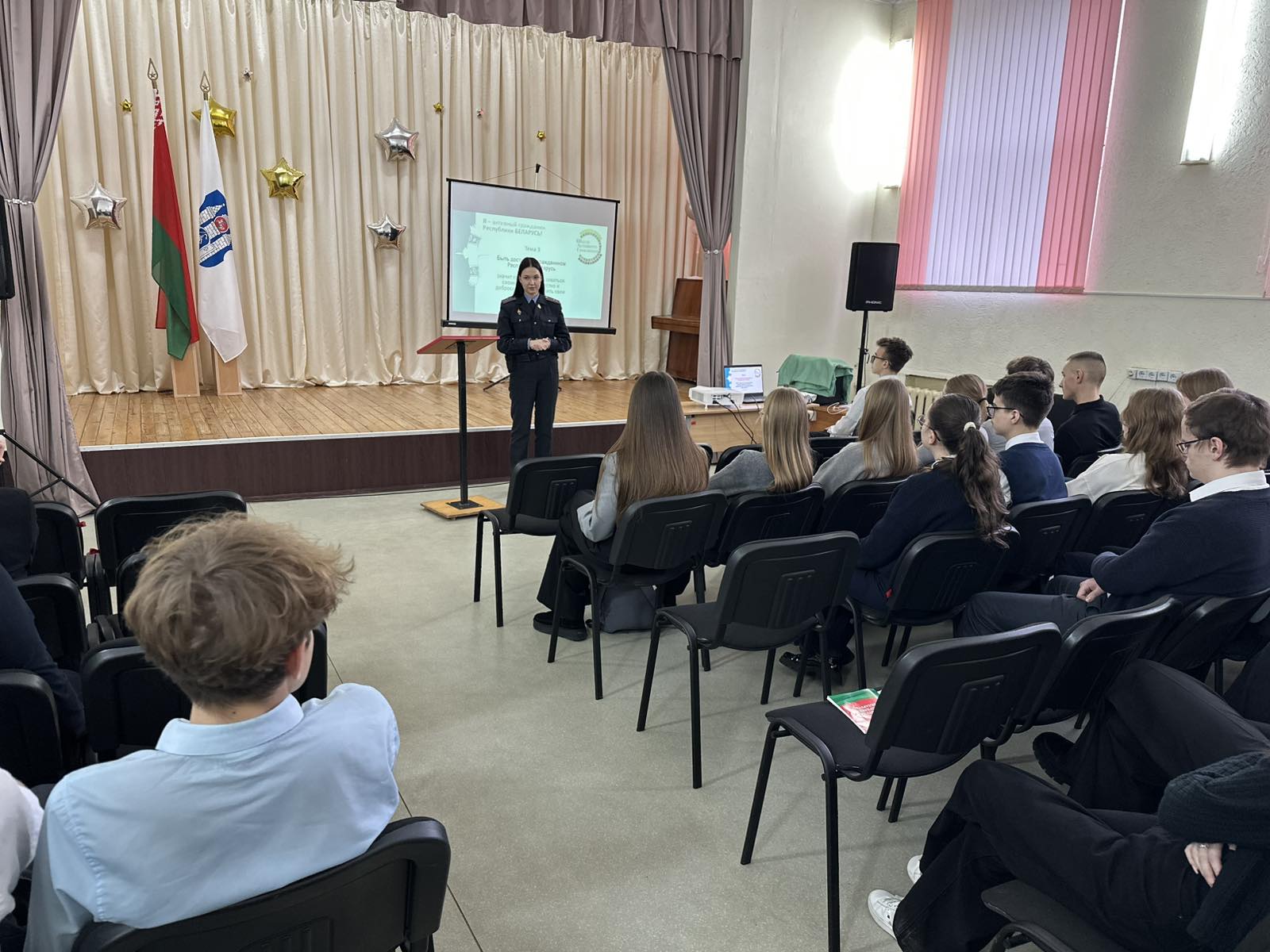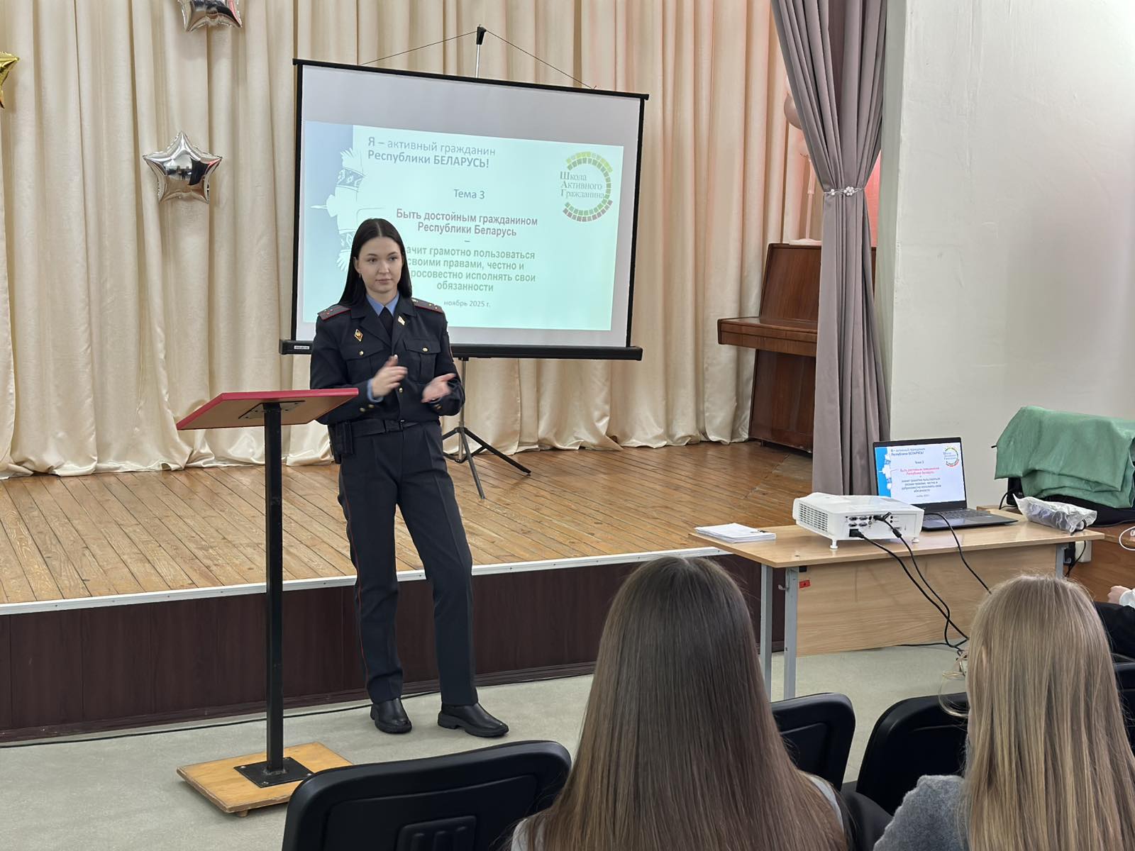 27 ноября в рамках информационно-образовательного проекта «ШАГ» в 9-11 классах прошел информационный час «Быть достойным гражданином Республики Беларусь — значит грамотно пользоваться своими правами, честно и добросовестно исполнять свои обязанности». На занятии были актуализированы знания учащихся о главном законе страны — Конституции Республики Беларусь, о конституционных правах и обязанностях гражданина Республики Беларусь, гарантиях белорусского государства по защите прав и свобод граждан, обязанностях учащихся, правах ребенка, взаимосвязи прав и обязанностей. Также на мероприятии прошел открытый диалог с приглашенным гостем Дарьей Дмитриевной Жуковой, участковым инспектором по делам несовершеннолетних РУВД Ленинского района. Дарья Дмитриевна обратила внимание учащихся, что вместе с правами и обязанностями также существует и ответственность. Инспектор побеседовала с детьми про разницу административной и уголовной ответственности, о возрасте, с которого наступает ответственность, а также провела практическое упражнение на решение ситуационных задач с определением правонарушения и вида ответственности, очень подробно отвечая на вопросы учащихся.