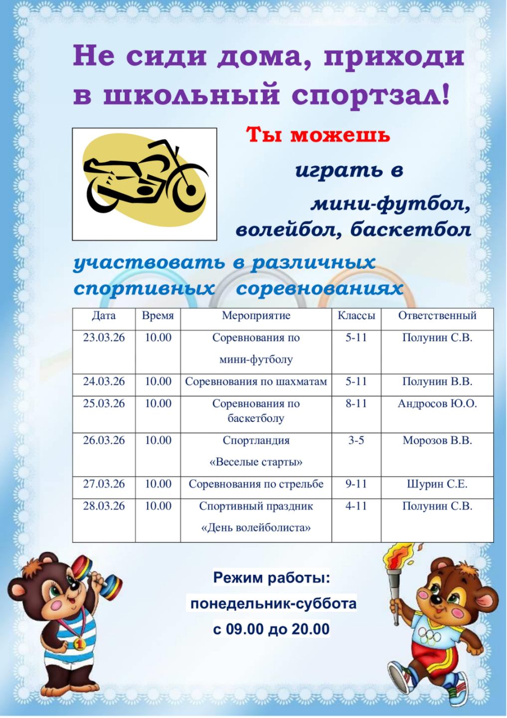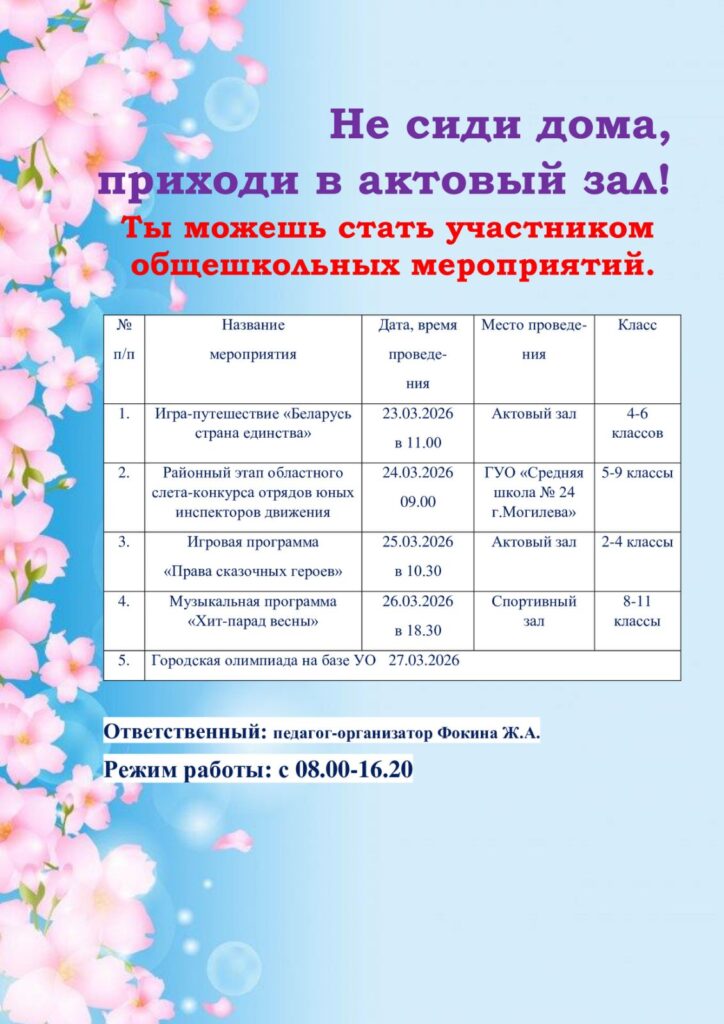 Режим работы государственного учреждения образования Средняя школа № 23 г. Могилева с 7.30 до 21.00 ежедневно, кроме воскресенья. Далее »