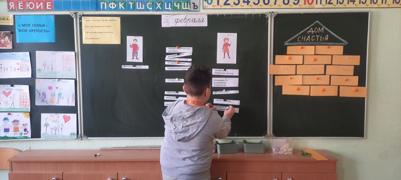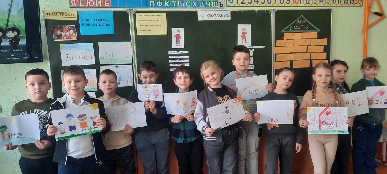 28 февраля с целью формирования представлений о роли семьи в жизни человека, семейных традициях и ценностях, воспитания и уважения к родителям во 2 «Б» классе прошло мероприятие ‘»Моя семья- моя крепость». В ходе мероприятия учащиеся разгадывали загадки о членах семьи, вспоминали пословицы о семье, распределяли обязанности между членами семьи, смотрели мультфильм, а также построили «Дом счастья», выбирая семейные ценности, которые делают семью счастливой. Закончилось мероприятие творческой минуткой «»Моя дружная семья».