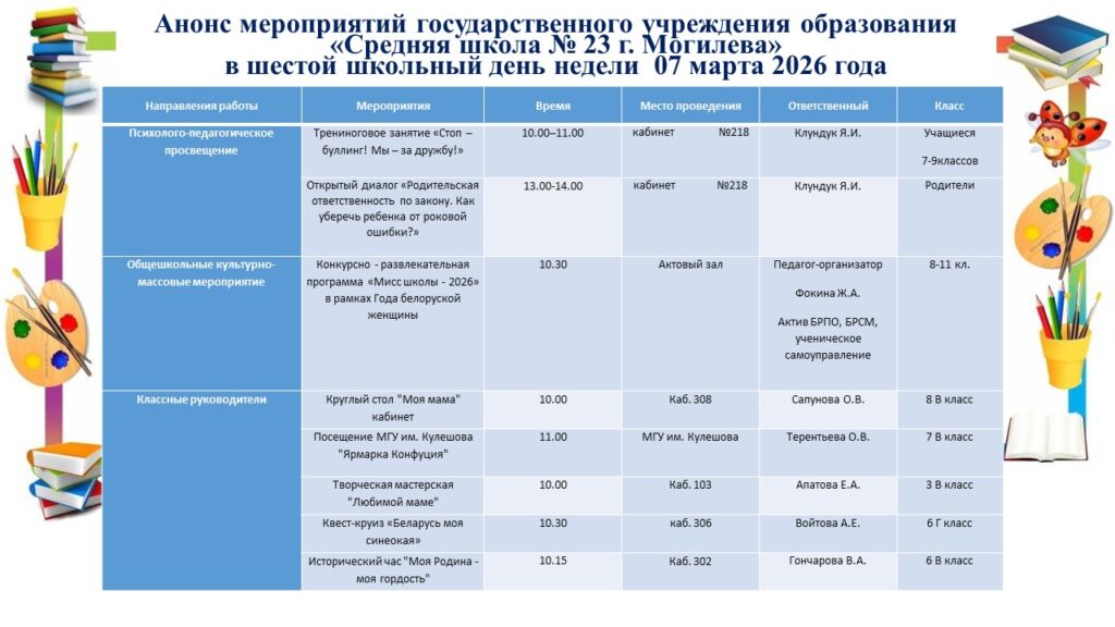 28 февраля в рамках шестого школьного дня прошла игровая программа «Праздники моей семьи». Целью данного мероприятия являлось воспитание уважения к семейным традициям и ценностям.Ребята рассказывали о праздниках и традициях, которые соблюдаются в их семьях, отвечали на вопросы викторины и отгадывали загадки на тему белорусских праздников. Мероприятие помогло расширить знания учащихся о культурных и исторических аспектах различных праздников, способствовало формированию чувства гордости за свою семью и её традиции, также оно помогло укрепить дружеские отношения через обмен опытом.