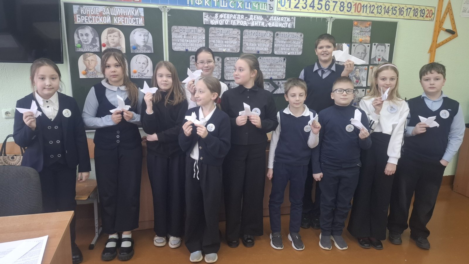 В 4 «Г» и в 5 Г классах прошло мероприятие, посвящённое Дню памяти юного героя-антифашиста. На мероприятии присутствовали учащиеся 7 «в» класса. Ребята рассказали истории юных героев. Поделились с младшими школьниками своими знаниями об этом дне. Завершилось мероприятие тем, что дети сделали своими руками голубей — символов мира.